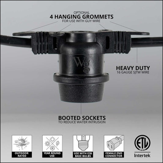 30' E26 Commercial Patio Light Stringer, SJTW Black Wire, 24" Spacing